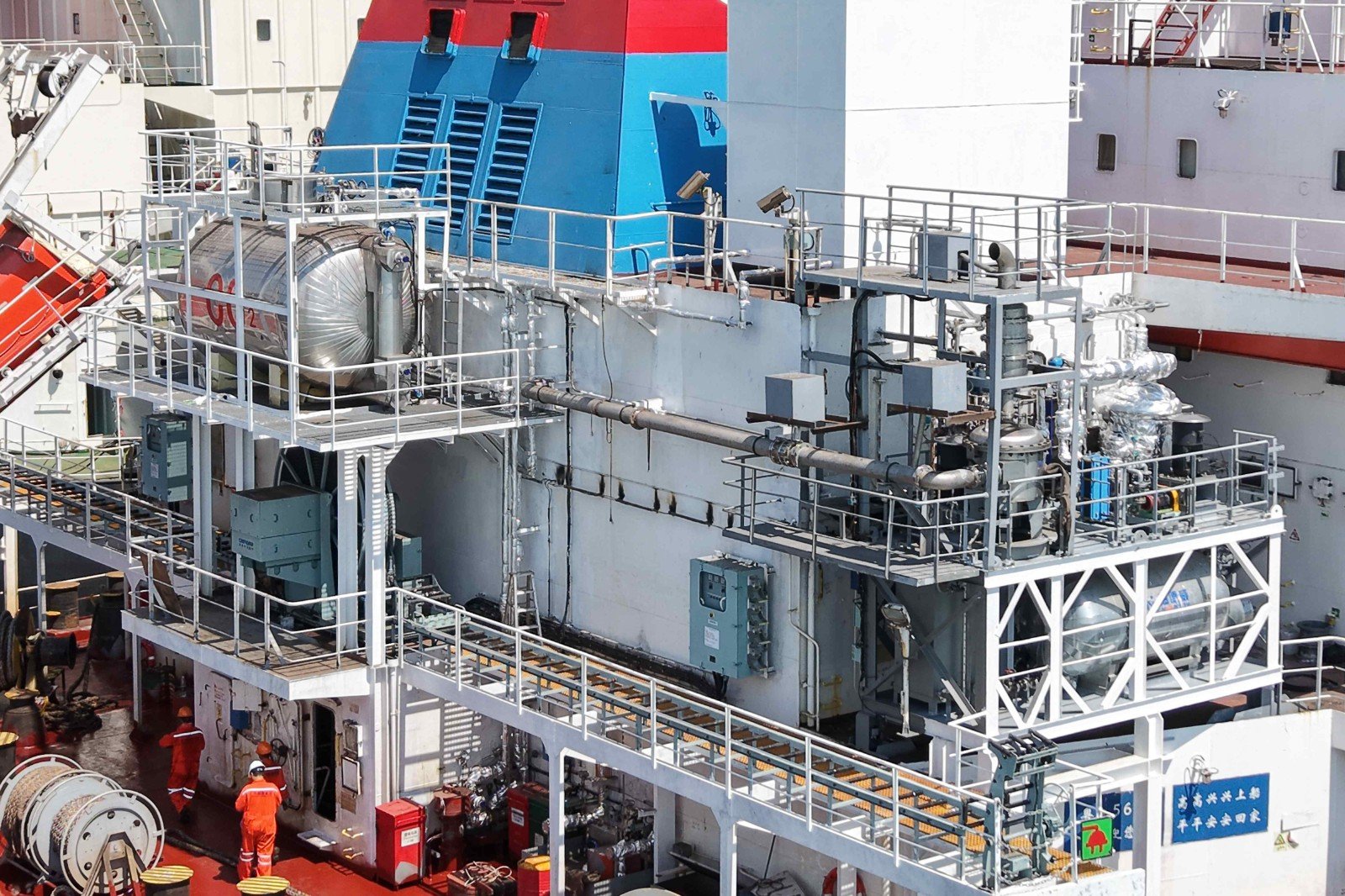 海洋衛(wèi)士?船載碳捕集系統(tǒng)依托海德威自主設(shè)計(jì)的高速離心脫碳技術(shù)和高性能吸收劑,以高速旋轉(zhuǎn)形成的離心力場(chǎng)替代傳統(tǒng)重力場(chǎng),顯著提升了氣液兩相傳質(zhì)效率,系統(tǒng)脫碳效率超過(guò)90%,二氧化碳捕集純度可達(dá)99.6%以上,具有脫碳效率高、體積小、能耗低、安裝及儲(chǔ)運(yùn)便捷等優(yōu)勢(shì)。